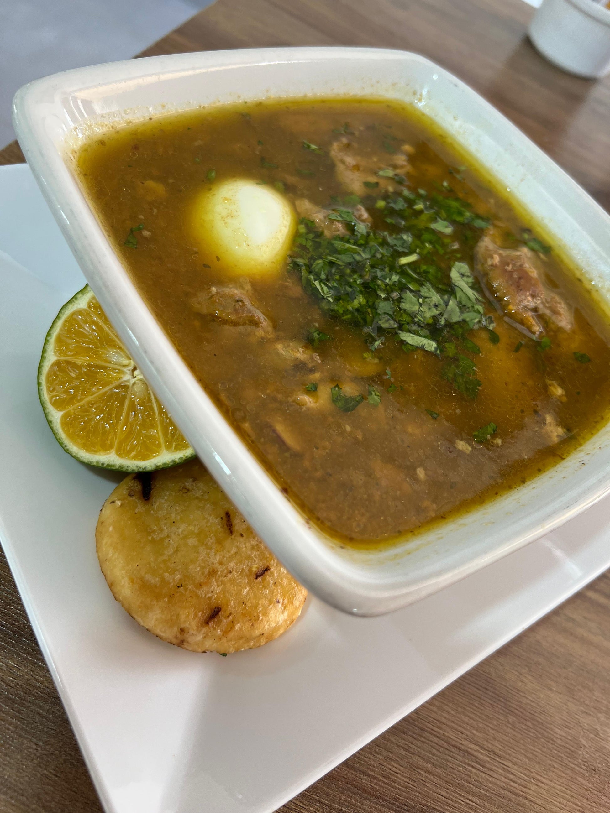 Delicioso consomé de menudencia fina de 16oz, con arepa, huevo, cilantro y limón